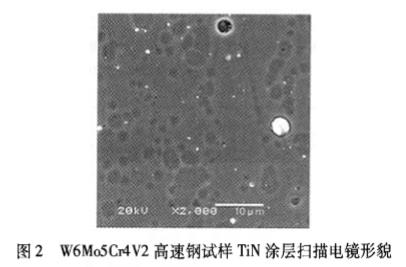 图2为W6M05Cr4V2高速钢试样涂层的表面形貌,涂层横截面厚度为3.2um。由图2可见,TiN膜层均匀、致密,涂层表面平滑,Ti滴(白色)数量少,并且颗粒大多数较细小。照片中黑色阴影应是沉积时离子轰击致使液滴脱落而留下的痕迹。液滴数量少及液滴尺寸小,有利于提高TiN涂层的表面硬度及致密性,从而提高涂层的耐磨性及氧化抗力。