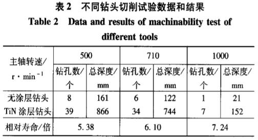 试验机床为Z5140A立式钻床,切削主轴转速分别为500r/min、710r/min和1000r/min,进给量为0.112mm/r,钻孔深度为22mm,切削方式为干切削。被加工材料为40Cr钢,经调质处理后硬度为36-40HRC。在试验过程中,当钻头发出剧烈尖叫声或异常震动等不能正常切削的现象时,立即停止试验。当切削主轴转速为500r/min时,无涂层钻头和有TiN涂层钻头都能够平稳地进行切削,且切削声音较小,有TiN涂层钻头的寿命约是无涂层钻头的5倍以上;当主轴转速为710r/min时,无涂层钻头已不能稳定地切削,且切削声音大;有TiN涂层钻头则能平稳地进行切削,且切削声音相对较小,有TiN涂层钻头的寿命大约是无涂层钻头的6倍以上。当主轴转速为1000r/min时,无涂层钻头在刚开始钻孑L时就发出较大的尖叫声,第一孔还没钻完,钻头已经发红,发生了严重的烧损;有TiN涂层钻头却能相对平稳地进行切削,但切削声音也很大,寿命大约是无涂层钻头的7倍以上。切削试验数据和结果如表2所示。由表2的试验数据可知,随着切削速度的提高,涂层钻头相对无涂层钻头的优势更加明显。有涂层高速钢钻头可以适用于高速切削加工,寿命大约是无涂层钻头的5~7倍。