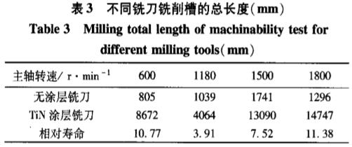 试验机床型号为XK5032数控立铣升降台铣床,GSK CNC Series990M控制系统。切削主轴转速分别为600r/min、1180r/min、1500r/min和1800r/min,进给量为0.13mm/r,铣削深度为2mm,切削方式为干切削。被加工材料为40Cr钢,经调质处理后硬度为36~40HRC。试验在被加工材料实体上铣削凹槽。在4种切削主轴转速的试验方案中,当无涂层铣刀发出剧烈尖叫声时,停止切削,检验发现4条侧刃后刀面磨损带VB≥0.5 mm(测量位置距离刃尖1mm),切削刃口已经磨钝或崩刃,因此认为无涂层铣刀已经达到刀具寿命的极限。而有TiN涂层铣刀切削声音相对较小,且侧刃后刀面磨损带仍较小,VB=0.2~0.3mm,还可以继续正常切削加工。由表3现场试验结果可以看出,有TiN涂层铣刀的寿命大约是无涂层铣刀的3~11倍。涂层硬质合金铣刀要在适当的切削速度中才能更好发挥刀具的使用寿命,其机理有待进一步探索。